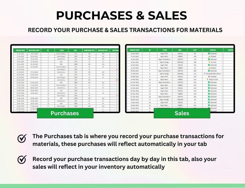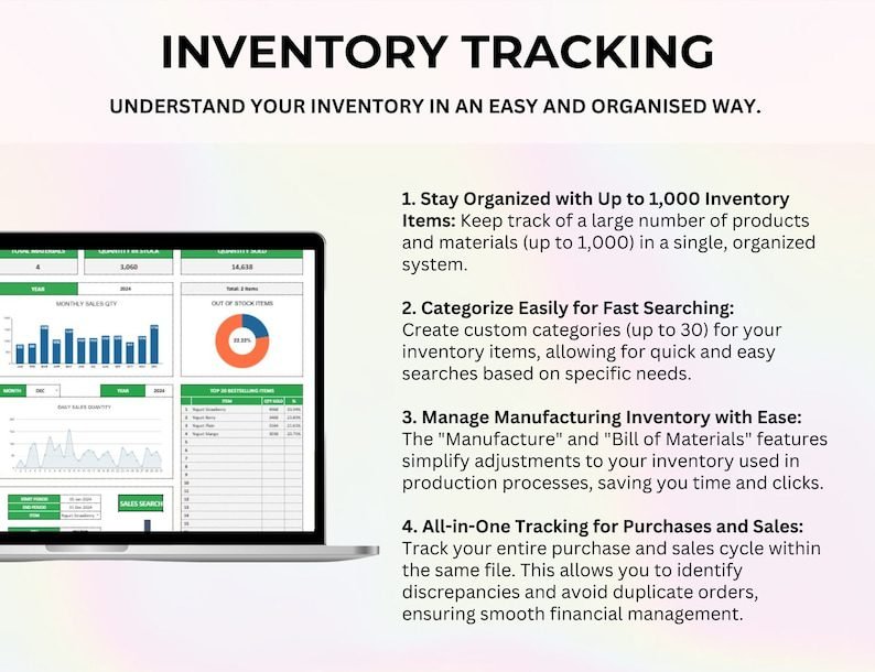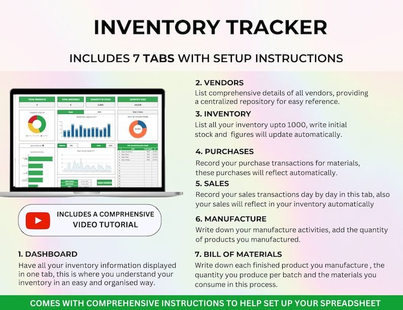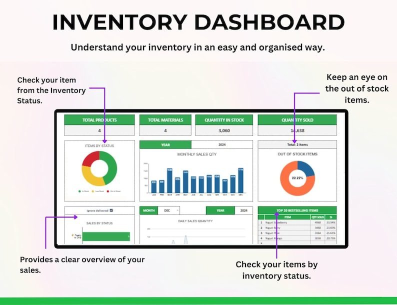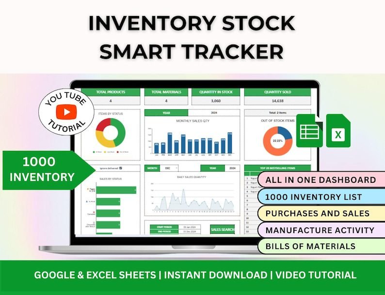 Easily stay on top of your stock, sales, and suppliers with this all-in-one inventory management spreadsheet. Track purchases to avoid duplicate orders, monitor product movement from “To Pack” to “Delivered,” and update material usage instantly for manufacturing or handmade products. The interactive dashboard provides a comprehensive overview of inventory levels, purchase history, sales performance, and vendor details—all automatically calculated for you. Designed to be simple, visual, and efficient, this Google Sheets inventory tracker helps you stay organized and prevent running out of stock.