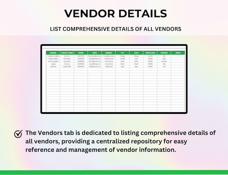 ✨ VENDOR LIST – The Vendors tab is dedicated to listing comprehensive details of all vendors, providing a centralized repository for easy reference and management of vendor information. Efficiently track vendor contacts.