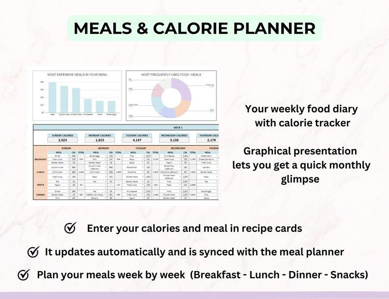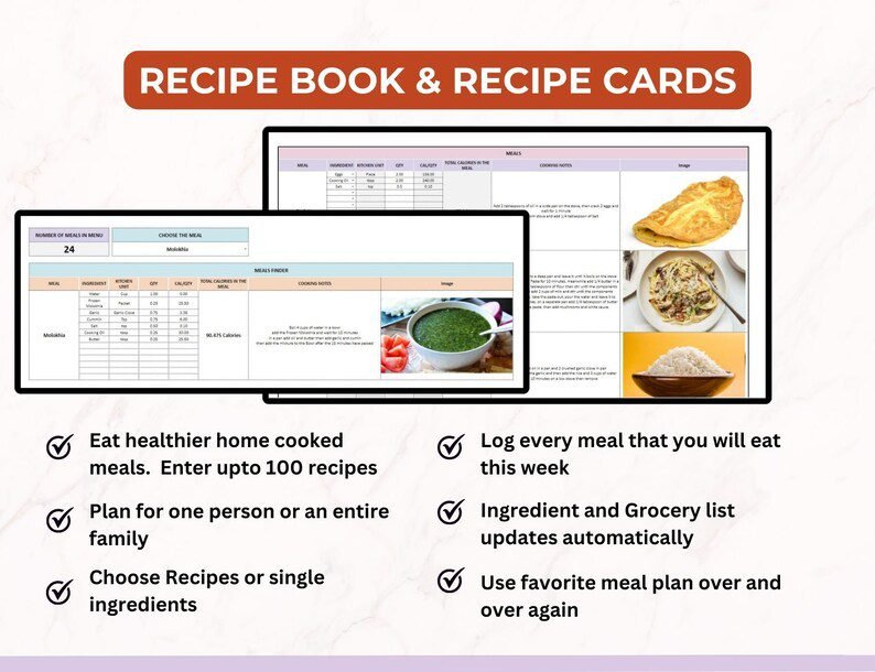 Plan your meals for the week easily by adding your favorite recipes, and it’ll make a grocery list for you automatically. You can even use it for the next week without any hassle. Print your grocery list or just check it on your phone or tablet. Put your recipes in the recipe cards and find them easily later in the recipe book. Try the pantry method to use up what you have and save money. If you’re watching your macros and calories, this planner can track them for you. You don’t need another app or spreadsheet. You can choose to use the calorie counter if you want.
