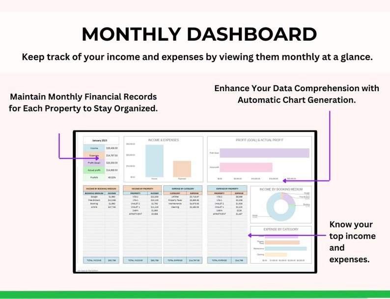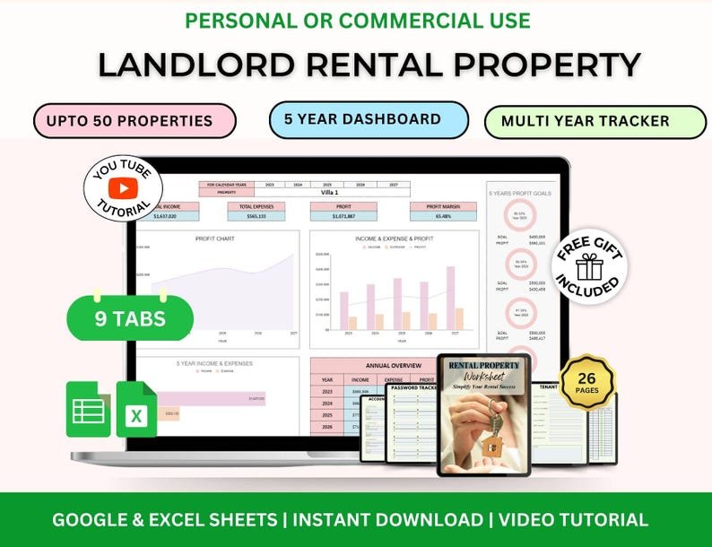 From property expenses to gross income calculations, every tab is built to simplify your workflow and show the true profitability of your real estate business. The 5-Year Dashboard gives you a clear view of your growth, helping you make smarter financial decisions with confidence.