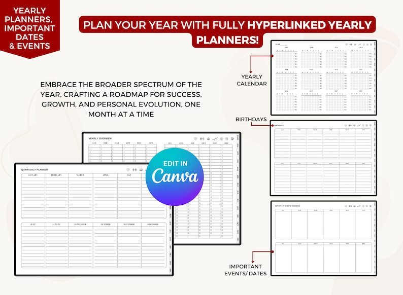 This planner was carefully created to help users boost productivity, set clear goals, and design a more balanced life. Its vintage-inspired aesthetic pairs creativity with structure, supported by a detailed system of hyperlinks and interactive buttons for a smooth, modern feel.