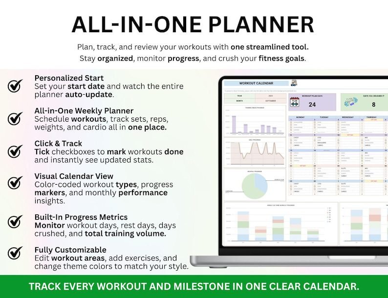 The Workout Planner Spreadsheet helps you stay consistent, accountable, and inspired on your fitness journey. Track every set, rep, and goal in one place — whether you’re training at home, in the gym, or anywhere in between. This planner keeps you focused on progress, helping you measure results and build lasting habits.