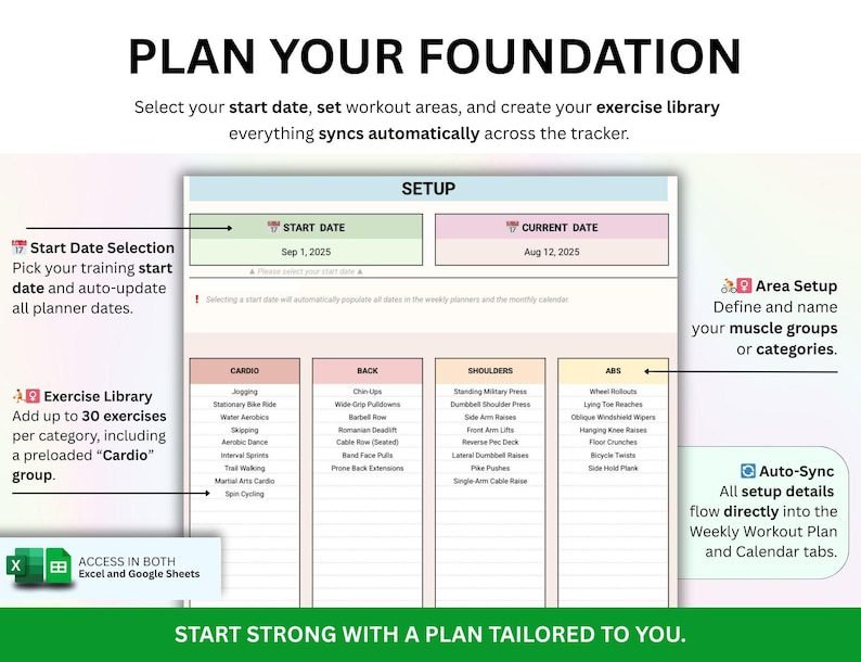 Adjust exercise types, add categories, or personalize colors and layout to fit your unique fitness routine.