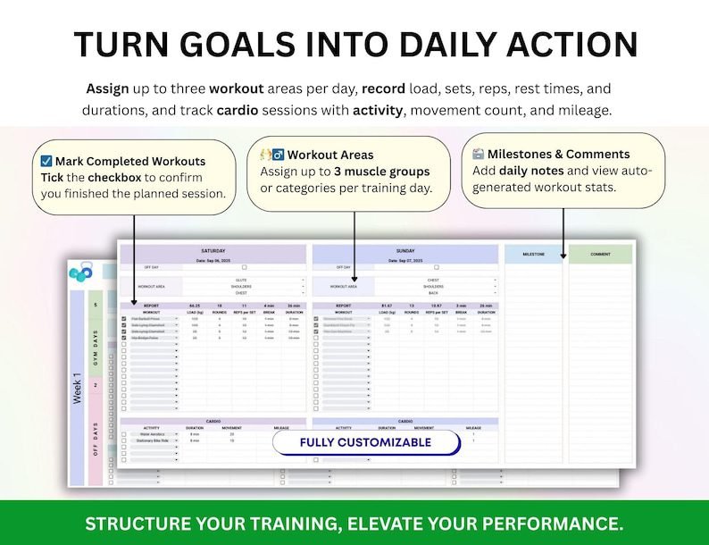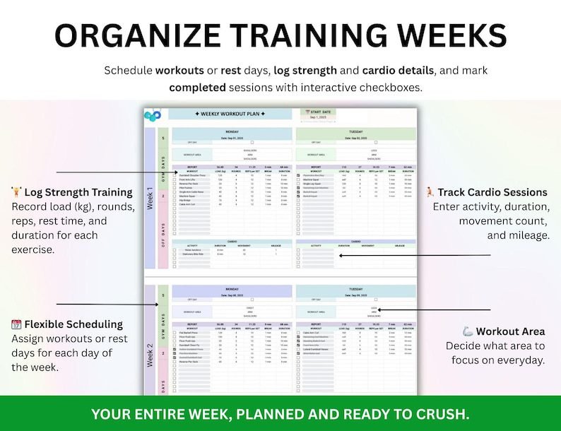 Plan workouts, track sets, reps, weights, and cardio sessions all from one sheet.